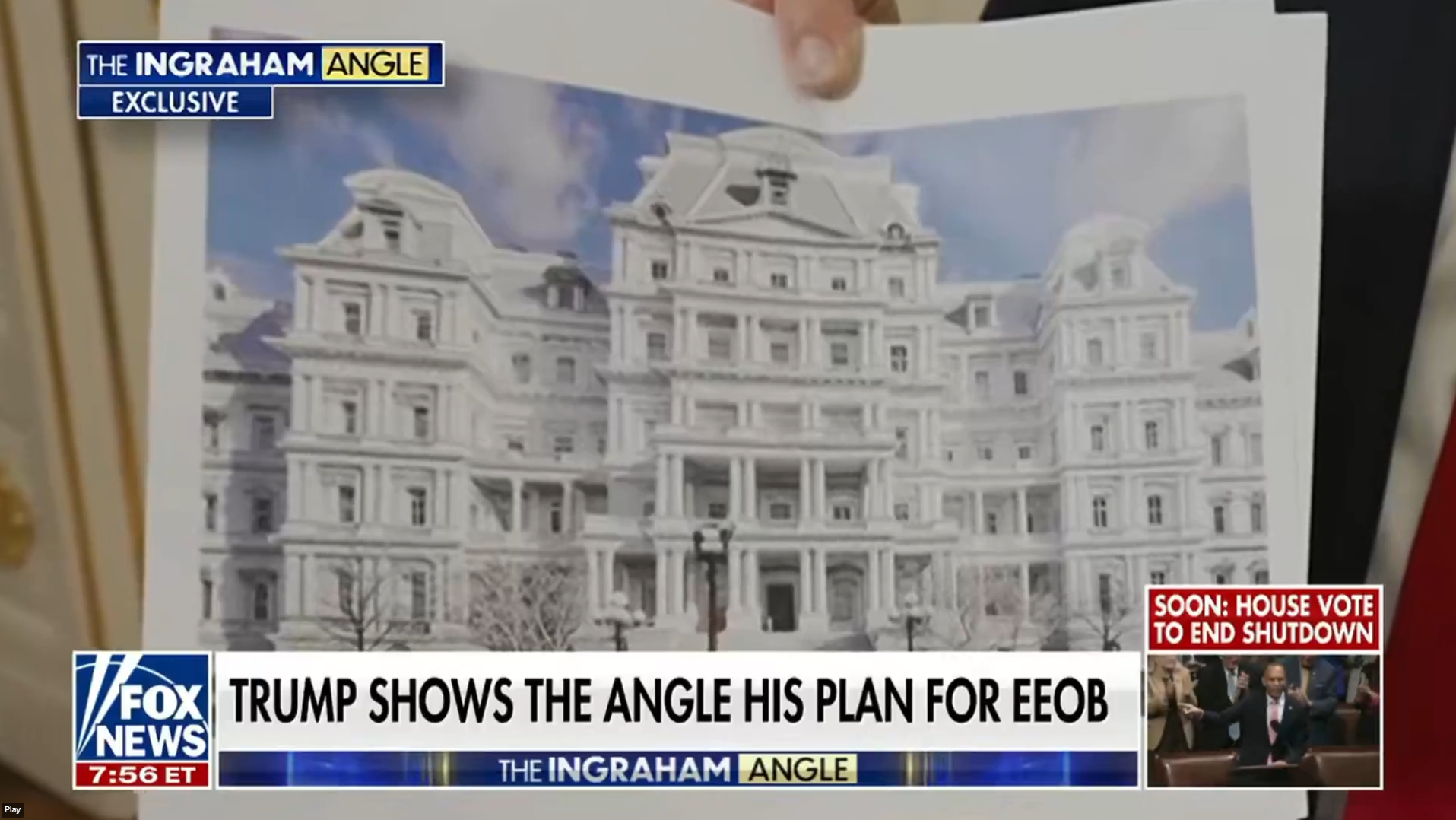 - Screenshots 1, 2, and 3 of President Trump showing conceptual drawings of every surface painted white. (Fox news, Ingraham Angle, Nov 10, 2025, posted online on Nov 12, 2025)